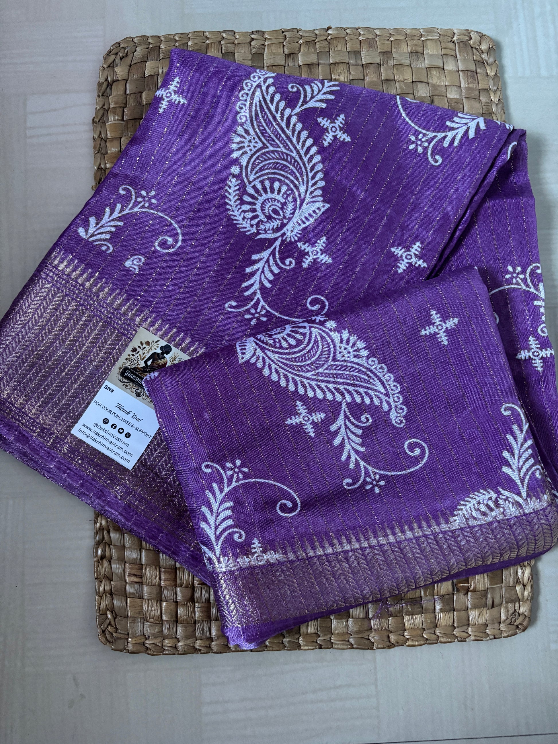 This lavender art silk saree features elegant white paisley motifs and a subtle zari border — lightweight, festive, and perfect for global celebrations.