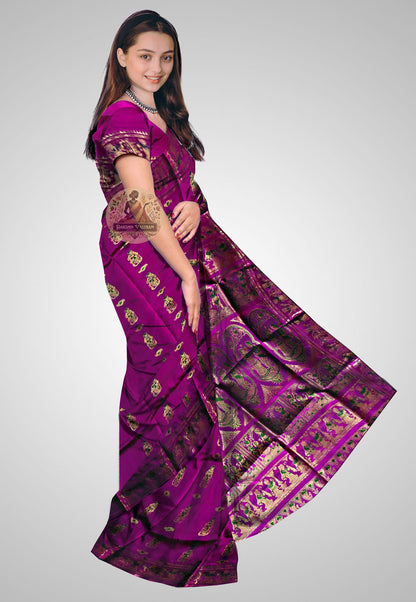 Discover the elegance of heritage with this Handloom Swarnachari Pure Silk Saree. Made with luxurious silk fabric and adorned with stunning golden motifs, it exudes timeless beauty. Ideal for grand occasions, this saree promises elegance and grace. A perfect fusion of tradition and luxury for your special moments.